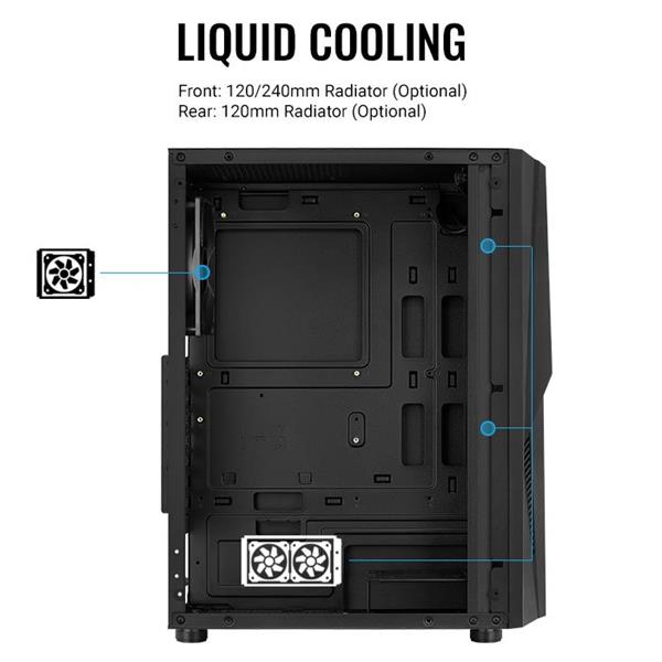 Podporuje kvapalinové chladenie v prednej a zadnej časti puzdra
