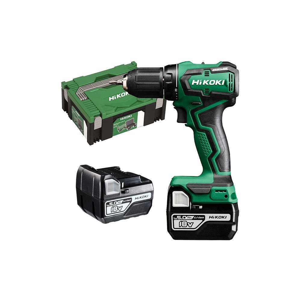 Vrtačka Hitachi / Hikoki DS18DDWPZ je oddávána v plastovém kufru spolu s dvěma bateriemi o kapacitě 5 Ah a nabíječkou.