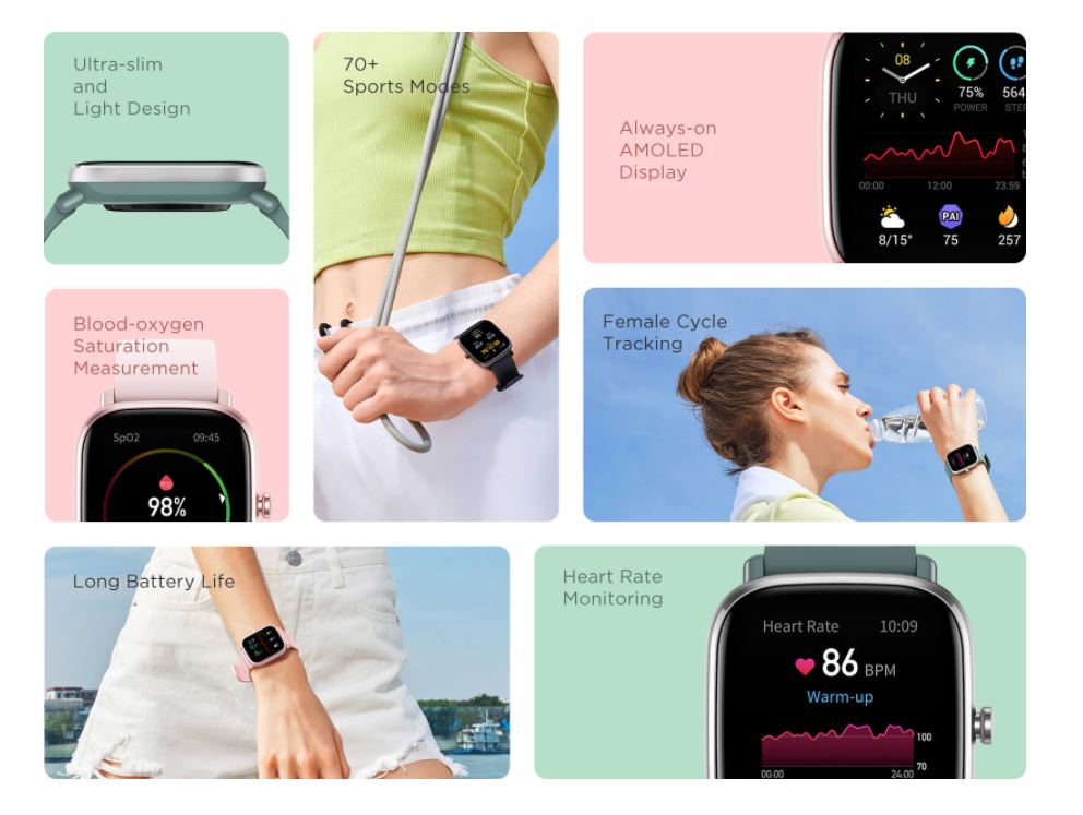 K nejsilnějším vlastnostem těchto hodinek patří tenký design, lehkost a AMOLED obrazovka s funkcí „Always on Display“. Zmínit musíme také schopnost měřit úroveň okysličení (saturaci) krve a podporu více než sedmdesáti sportovních aktivit.