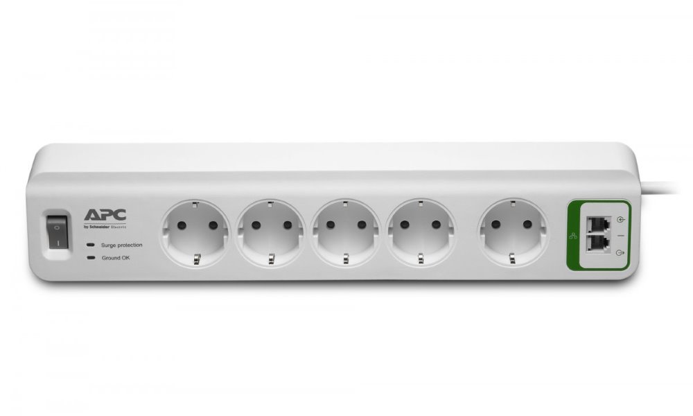 Praktická přepěťová ochrana nabízí 5 zásuvek a ochranu telefonní linky RJ11.