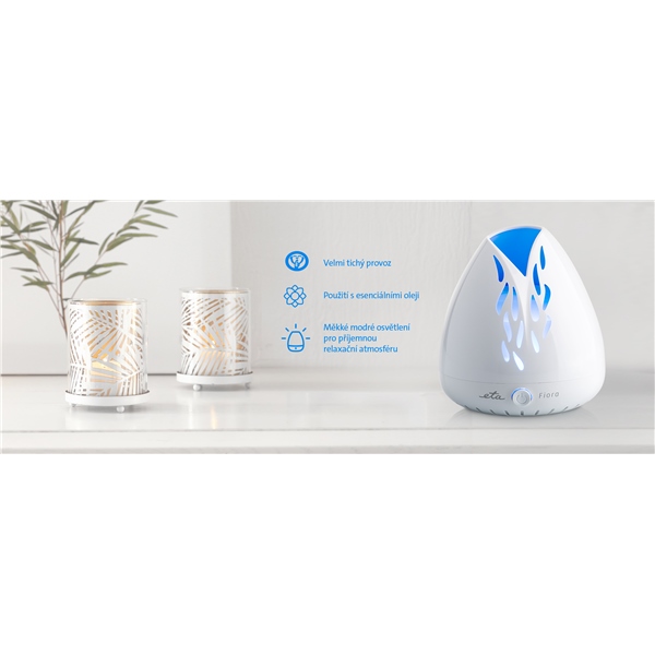 Levandule, citronová tráva nebo eukalyptus? Vonné oleje můžete střídat podle nálady či zdravotního stavu, maximální využití jejich potenciálu pak nechejte na elegantní aroma lampě ETA Fiora. Účinná aroma lampa Fiora vzduch v místnosti příjemně provoní. Ve vaší domácnosti tak bude radost se nadechnout i oddat se nezbytné relaxaci, kterou zintenzivní nejen vhodně zvolená vůně, ale i měkké modré osvětlení, jež provoz lampy po stisknutí příslušného tlačítka doprovází.