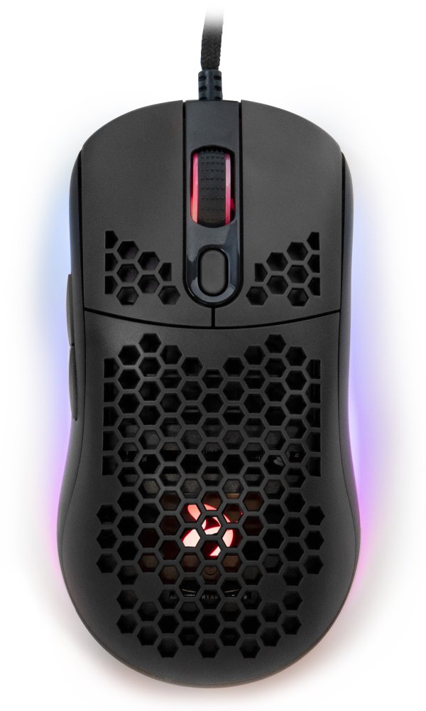 Ultralehká herní myš disponující 7 programovatelnými tlačítky a vysoce přesným optickým senzorem Pixart 3389 s rozlišením až 16000 dpi. Kryt v designu plástve snižuje celkovou hmotnost, zlepšuje odvod tepla, a tím zajistí i pevnější uchopení myši. Herní design poté doplňuje nastavitelné RGB podsvícení. Kvalitní spínače Omron vydrží více než 20 milionů kliknutí. Připojení je realizováno skrze opletený USB kabel.