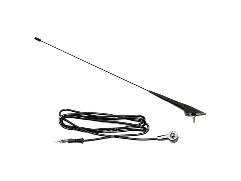 Střešní anténa určená pro příjem rozhlasového signálu v automobilu, složená ze šroubovacího prutu, upevňovací patice a přívodního kabelu. - Délka prutu: 45 cm; délka kabelu: 200 cm; anténní prut: matice M6; anténní patice: šroub M6