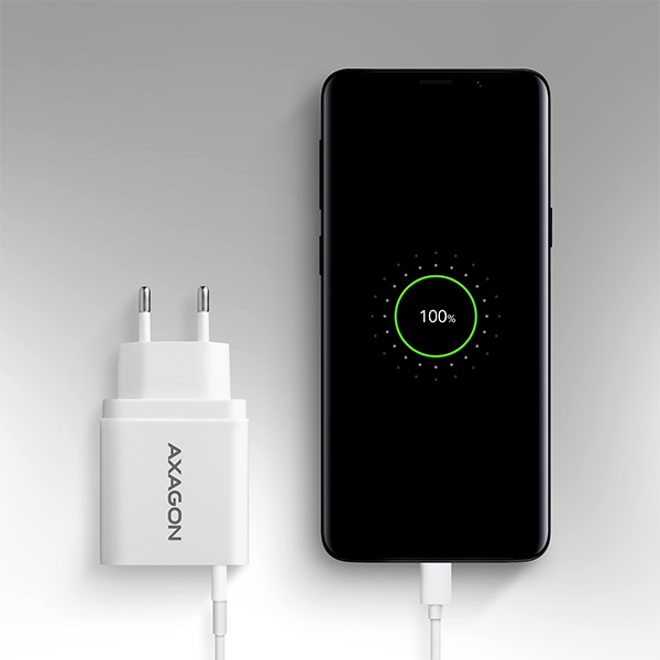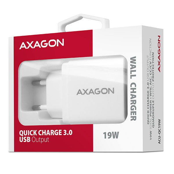 USB nabíječka do sítěAXAGON ACU-QC19Ws technologiíQuick Charge 3.0pro rychlé nabíjení mobilních zařízení.