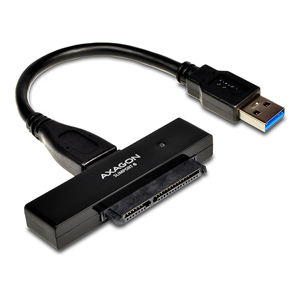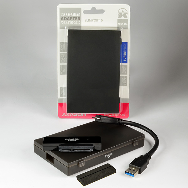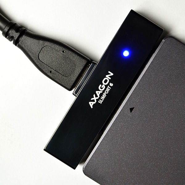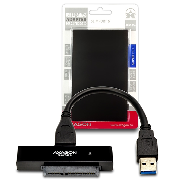 Kompaktní vysokorychlostní adaptérAXAGO ADSA-1S6 SLIMport6s USB 3.0 a SATA 6G rozhraním určený pro snadné připojení SSD nebo