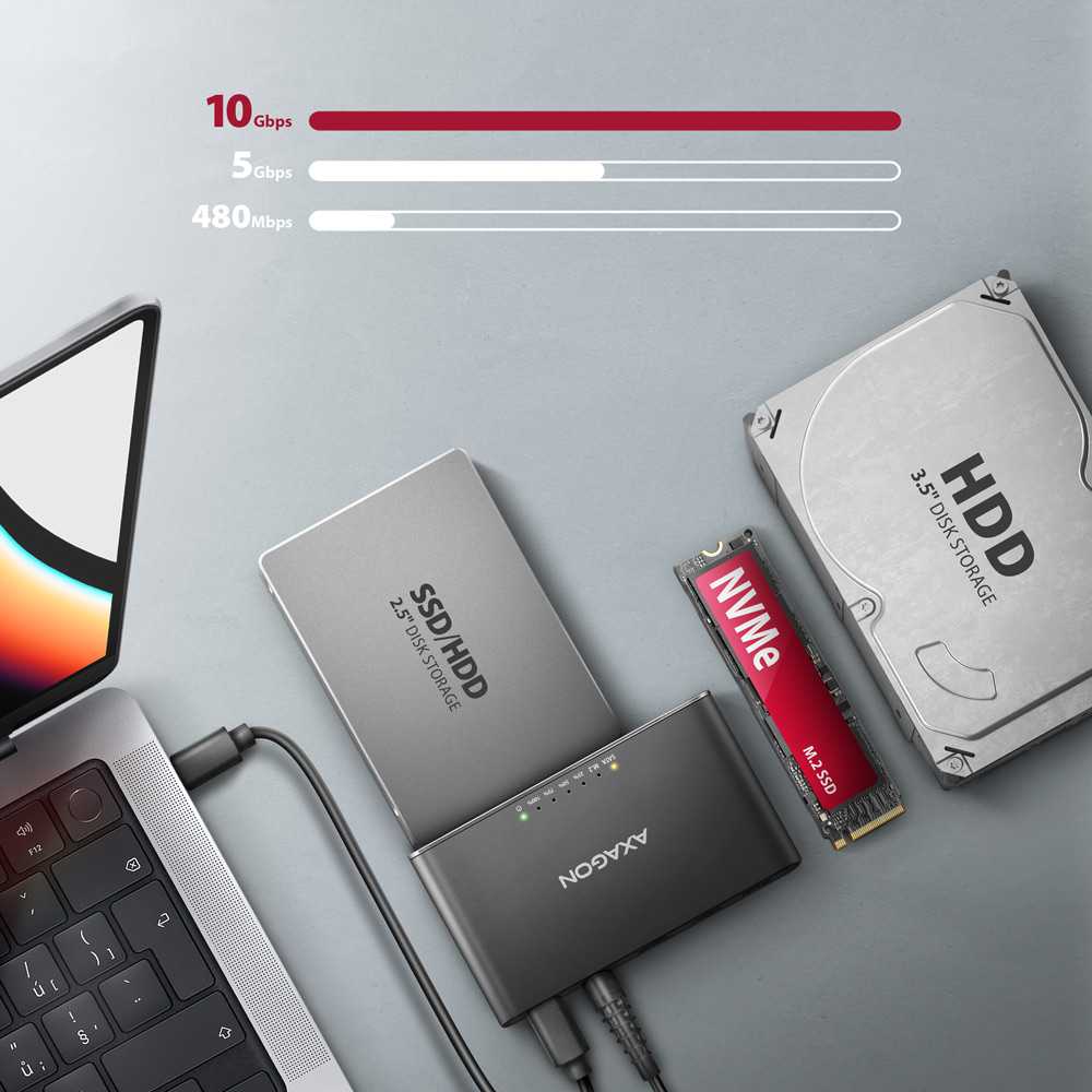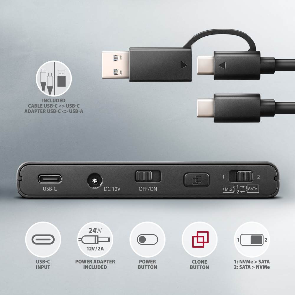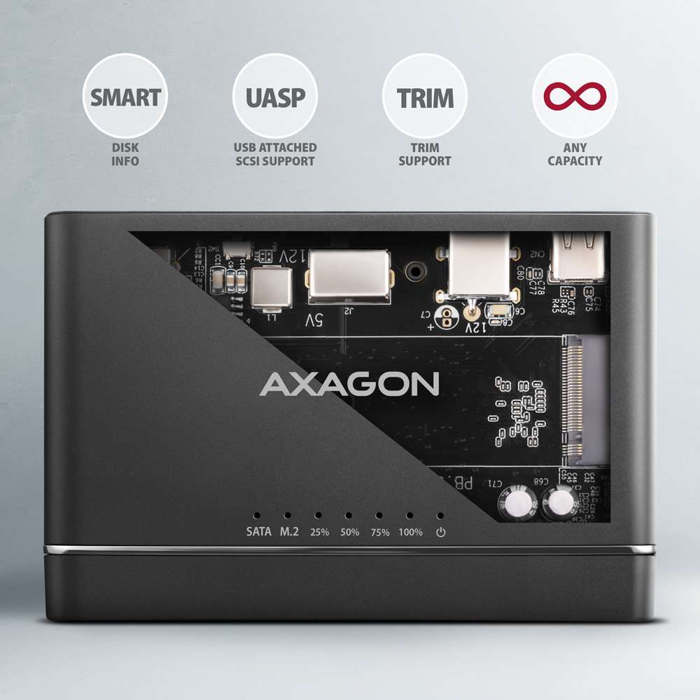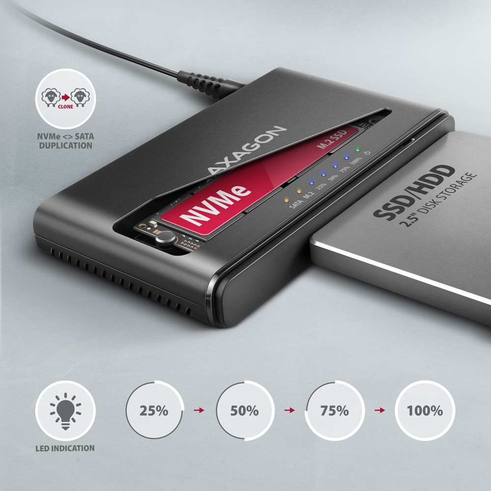 USB 3.2 Gen 2 adaptér pro připojení NVMe M.2 SSD a SATA 2.5"/3.5"