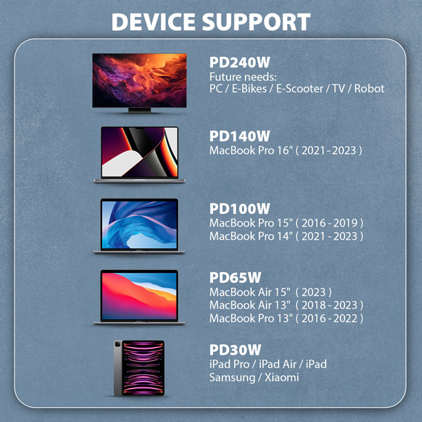 Kabel má implementovánu nejnovější specifikaci nabíjecí technologiePower Delivery 3.1. Tato technologie přináší mimo jinévýkon 240Wcož je více než dvojnásobek oproti Power delivery 3.0, která