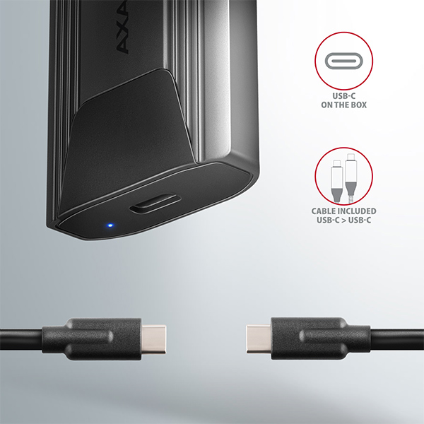 Super rychlý externíAXAGON EEM2-GTS THIN SCREWLESS boxs USB 3.2 Gen 2 rozhraním je určen proNVMe (PCI-Express) M.2 SSDdisky. Spolehlivé připojení k počítači umožňuje oboustrannýUSB-C konektorna boxu spolu s dodávaným kabelem USB-C -> USB-C.