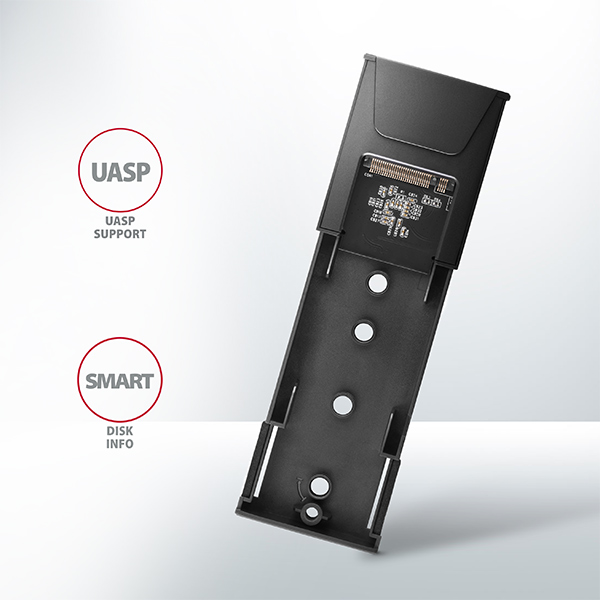 přenosovárychlost až 10 Gb/s. Externí M.2 box podporuje i další moderní funkce např.UASPa umožňuje čteníS.M.A.R.T.informací monitorujících stav disku. Podpora úsporného režimu při