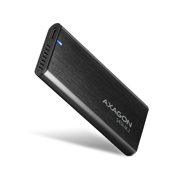 Hliníkový externíAXAGON EEM2-SBC RAW boxs USB 3.2 Gen 2 rozhraním určenýpro SATA M.2 SSD disky. Spolehlivé připojení k počítači umožňujeoboustranný USB-C konektorna boxu spolu s dodávaným kabelem USB-C -> USB-A.