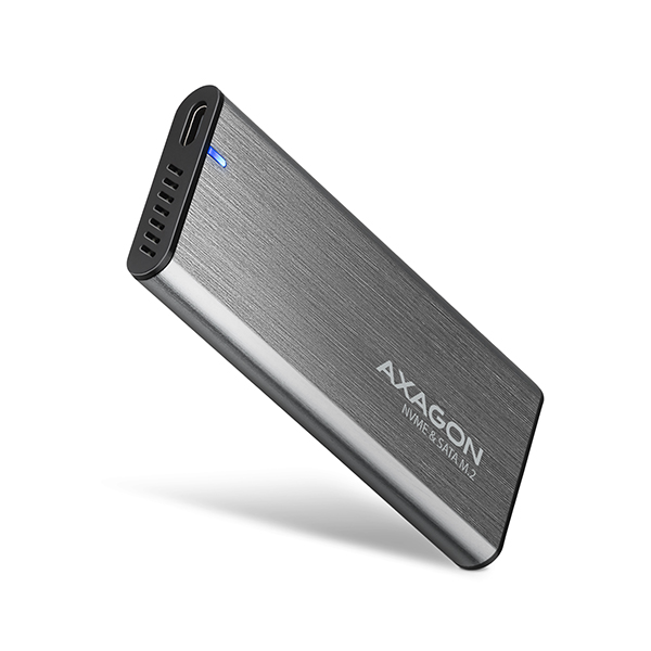 Univerzální externíAXAGON EEM2-SG2 RAW boxs USB 3.2 Gen 2 rozhraním určenýpro M.2 NVMe nebo SATA SSD disky. Spolehlivé připojení umožňujeoboustranný USB-C konektorna boxu. V balení naleznete nejen kabel USB-C -> USB-A pro