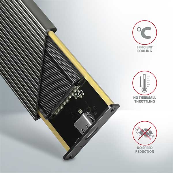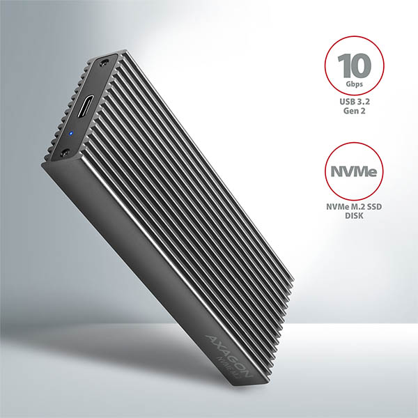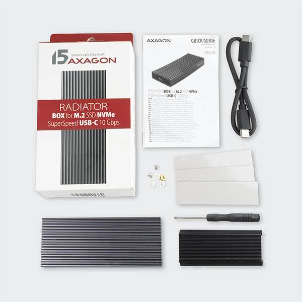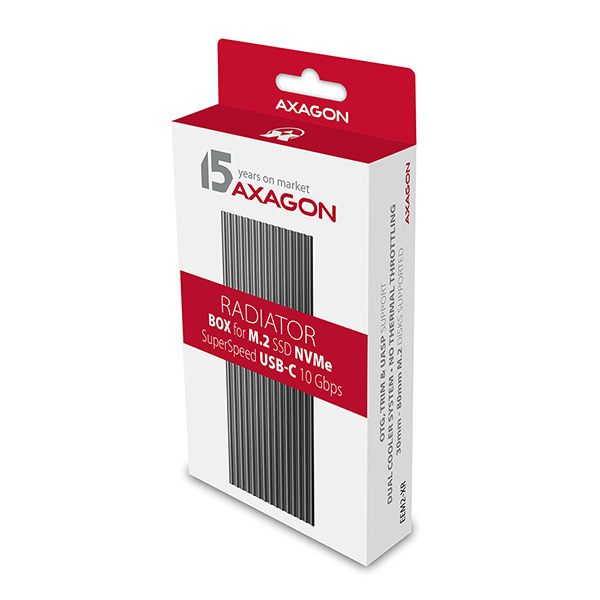 Super rychlý externí boxAXAGON EEM2-XR RADIATORs USB 3.2 Gen 2 rozhraním je určen proNVMe (PCI-Express) M.2 SSDdisky. Velkou předností hliníkového boxu jedvojité chlazení disku, s kterým vložený disk pracuje při nejnižší možné teplotě.