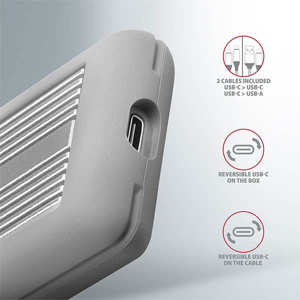 přenosovárychlost až 10Gb/s. Pohodlné připojení umožňujeoboustranný USB-Ckonektor. V balení nalezneterovnou dva kabelypro připojení boxu - klasický kabel USB-A / USB-C a také USB-C /
