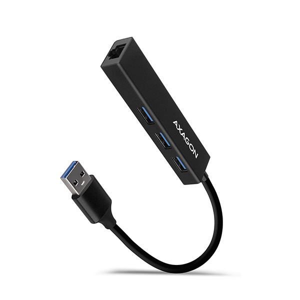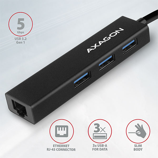Štíhlý kovový USB 3.2 Gen 1 (USB 3.0)multi-port hub AXAGON HMA-GL3Anejen připojí k notebooku nebo počítači ažtři USB zařízenísoučasně, ale přidá takégigabitovou síťovou kartu, která připojí váš počítač k vysokorychlostní síti.Kovové tělohubu je vyrobeno z hliníku a zajišťuje tak dokonaloumechanickou ochranupro časté přenášení. Elegantní, jemně strukturovaný povrch brání