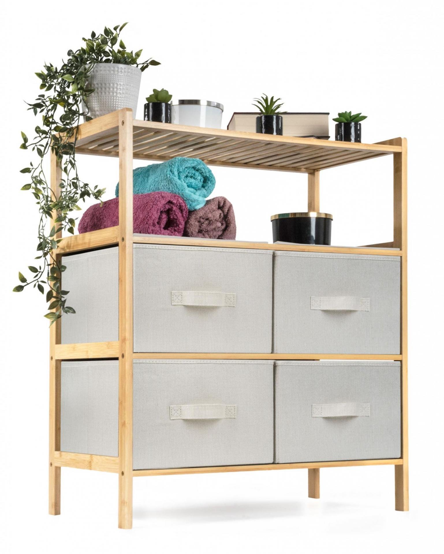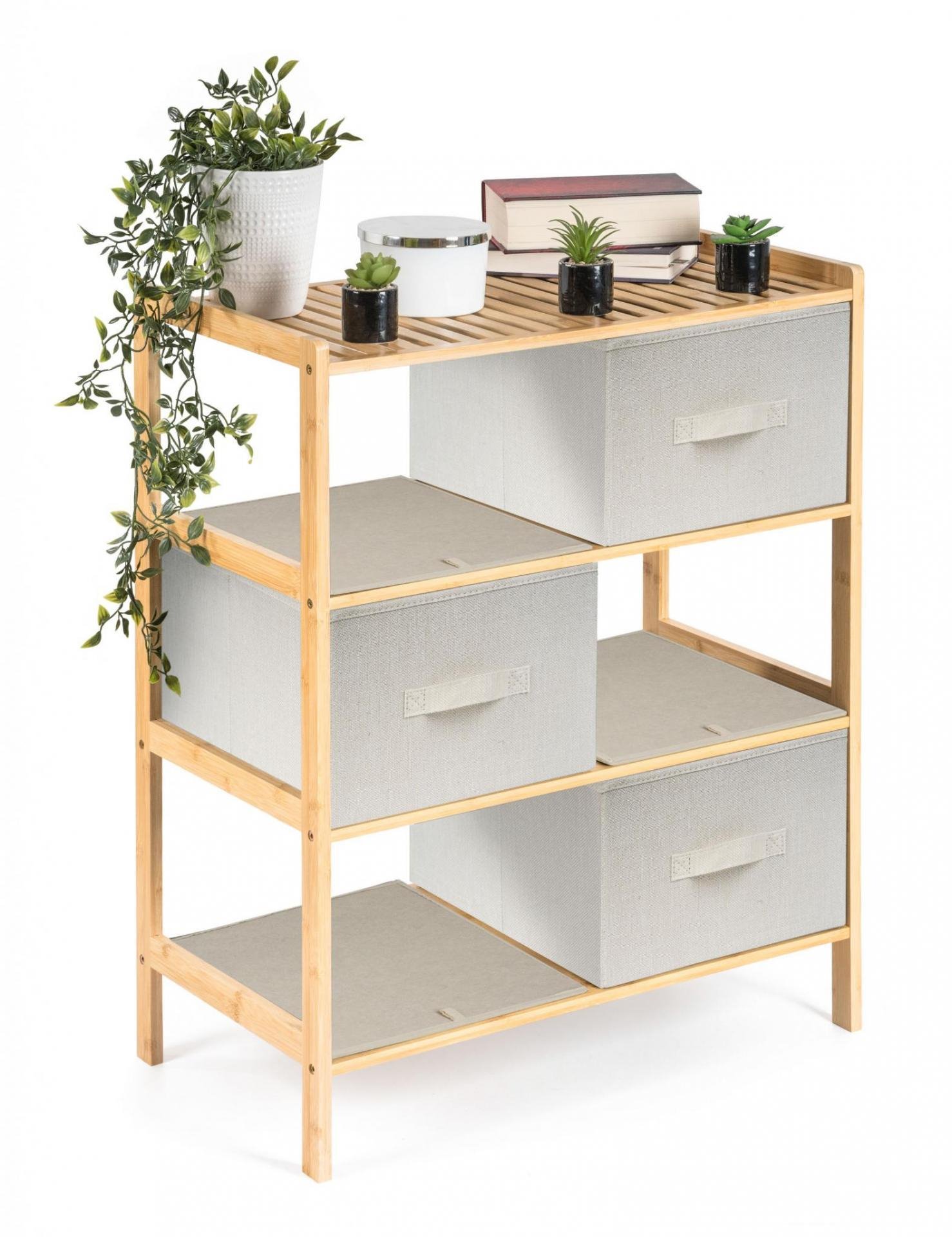 Bambusový regál s výsuvnými látkovými zásuvkami dodává interiéru příjemný přírodní dojem, pocit lehkosti a přirozenosti, zatímco jeho pevnost a dlouhá životnost zajišťují stabilitu a trvanlivost.