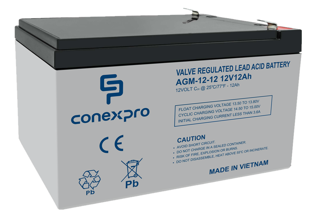 Hermeticky uzavřený olověný akumulátor Conexpro AGM-12-12 o kapacitě 12 Ah a napětí 12 V je vhodný pro zdroje nepřerušovaného napájení, požární, zabezpečovací, přístupové, telekomunikační a solární systémy i pro celou řadu dalších aplikací. Řadí se mezi bezúdržbové VRLA AGM baterie s elektrolytem, který je nasáklý v netkané tkanině ze skelných vláken. Tento model je tak odolný vůči otřesům a vytečení a práce v náklonu či jiné poloze mu nebude dělat žádné obtíže. Akumulátor má navíc výborné nabíjecí charakteristiky, nabízí lepší teplotní stabilitu, odolá cyklické zátěži (nabíjení a vybíjení) a dosahuje životnosti až 10 let, díky čemuž vám bude sloužit naprosto spolehlivě.
