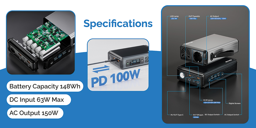 Kapacita baterie 148Wh • AC 230V výstup 150W max. • USB-C PD