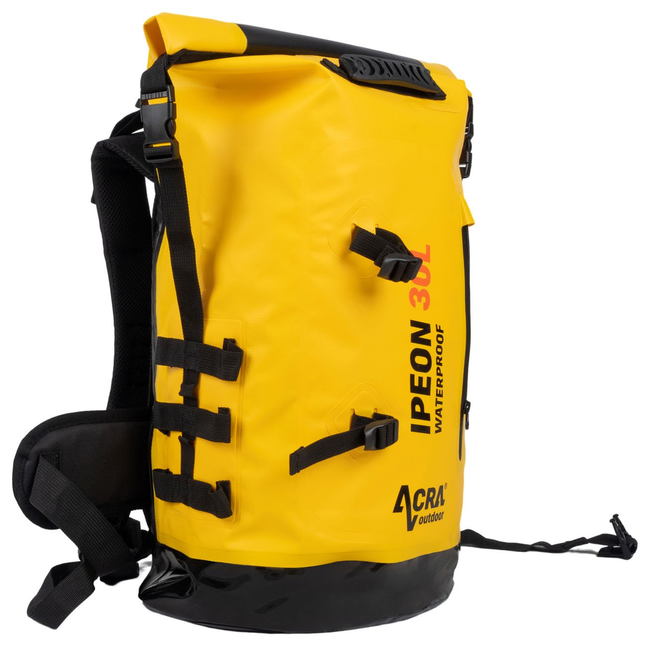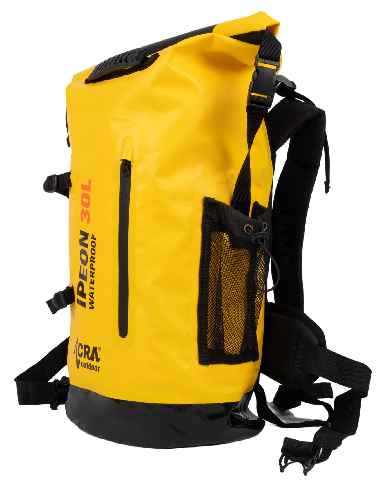Jak nejlépe ochránit oblečení, obuv a další věci před namočením při vodní turistice? Je dobré s sebou vzít vodotěsný batoh Acra Ipeon 30 l a vše do něj zabalit. Veškeré švy jsou opatřeny vrstvou PVC a průniku vody zabrání i nepropustný uzávěr. Batoh má dva polstrované ramenní popruhy a dva příčné hrudní a břišní stahovací popruhy s karabinkami pro dokonalé upevnění batohu při nošení. Zadní část je polstrovaná i s odvětráváním, jako u klasických batohů. U batohu nechybí ani jedna velká kapsa na boku. Rozměry vaku jsou 67 cm, průměr 45 cm a hmotnost je kolem 1160 g.