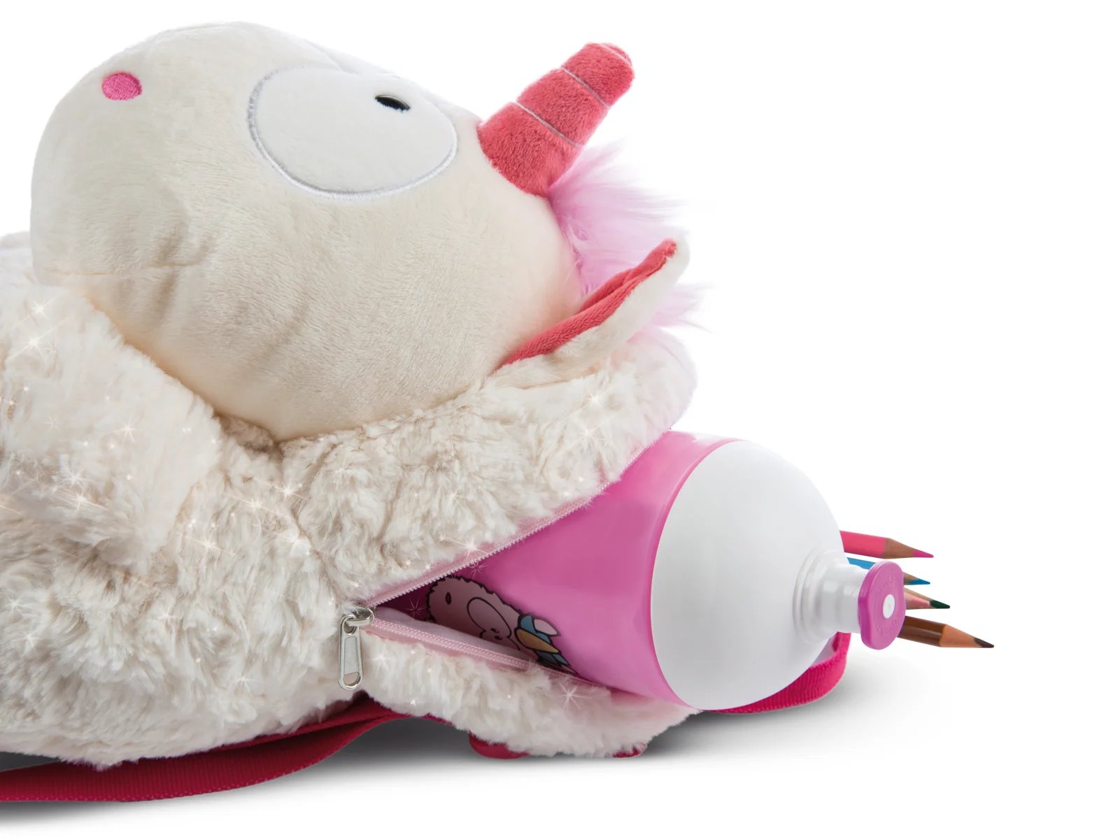 Krásný batoh Theodor od značky Nici zaujme každou malou slečnu. Batoh má jedinečný vzhled s jednorožčím kamarádem Theodorem. Jednorožci nechybí příjemná plyšová srst, veliké oči, krásná barevná hříva a výrazný růžový roh. Mezi praktické prvky batohu patří nastavitelné popruhy a poutko pro snadné držení. Batoh má jednu velkou kapsu. Rozměry jsou 24 x 37 x 18 cm. Značka Nici používá k výrobě recyklované materiály jako například použité PET láhve.