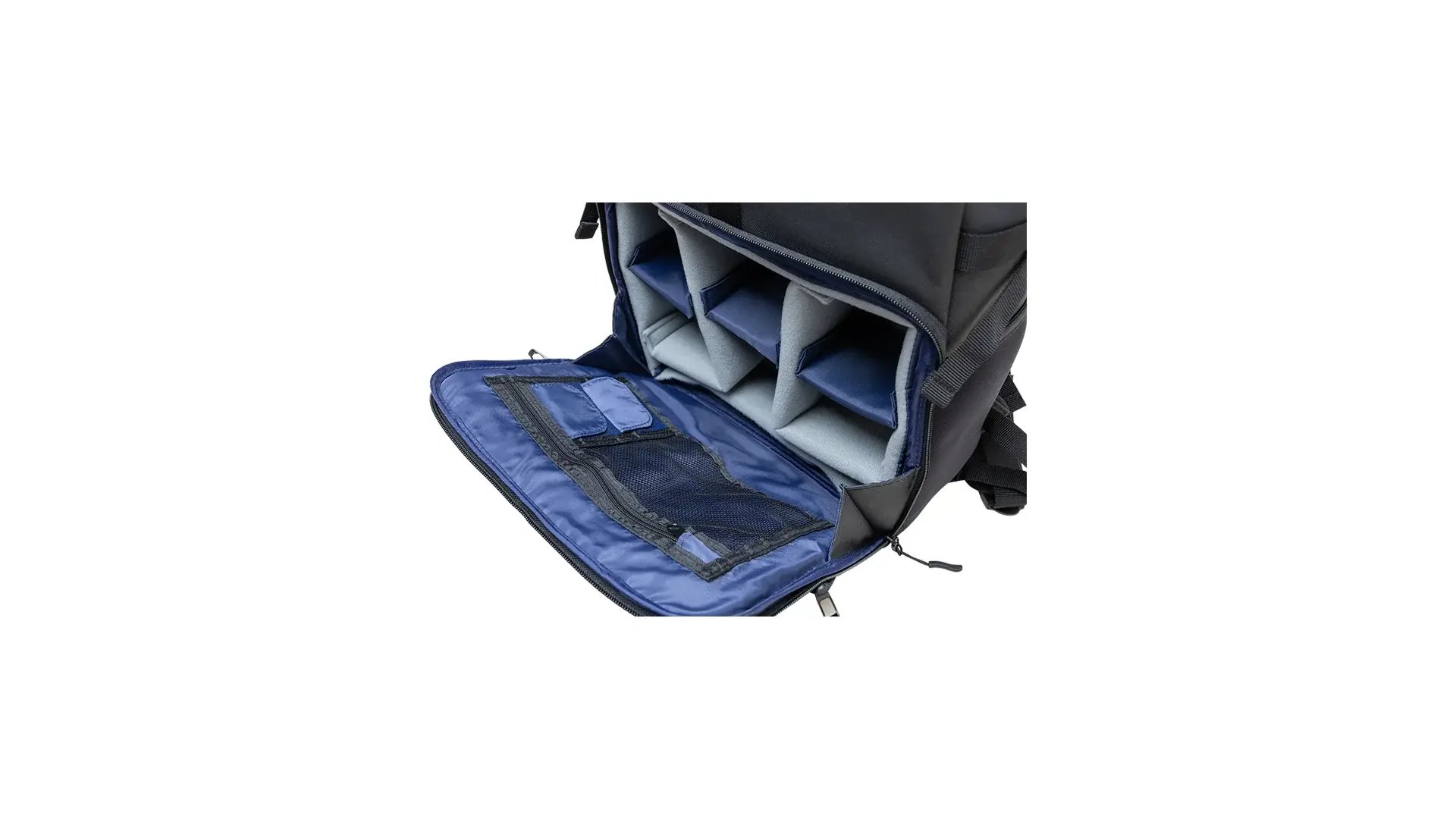 Bederní a hrudní popruhy si nastavíte podle potřeby. Kvalitně podšité ramenní popruhy poskytují vysoký komfort při dlouhém nošení. Černá tkanina, ze které je batoh vyrobený, odpuzuje vodu. Vyztužené dno modrou vnitřní podšívkou je odolné vůči nečistotám. Batoh je ideální na fotografování, outdoorové aktivity i každodenní nošení.
