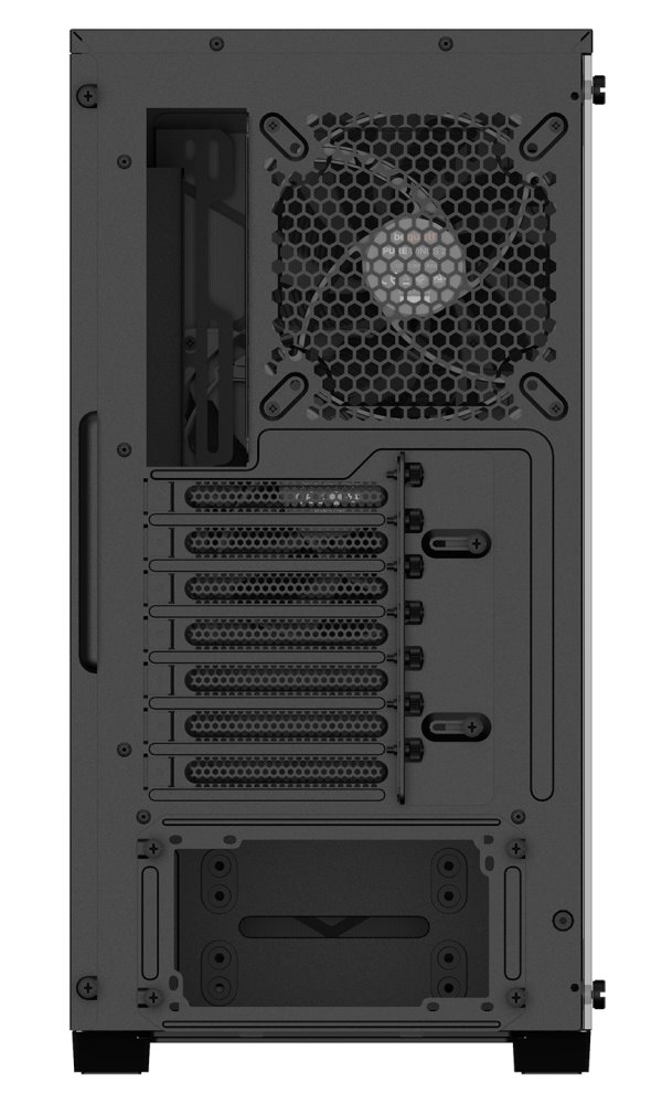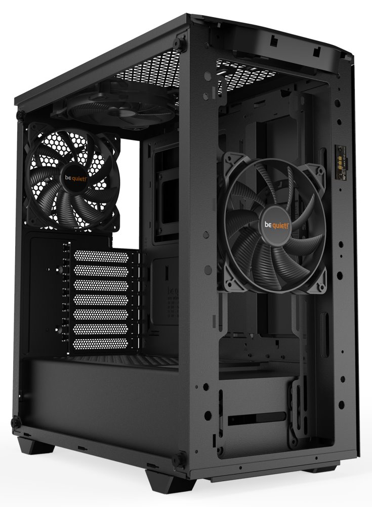 Skříň s průhlednou bočnicí a ARGB LED osvětlením nabízí dvě 3,5" pozice pro pevné disky a pět 2,5" pozic pro SSD disky. Na předním panelu naleznete jeden port USB 3.0, jeden port USB typu C a dále také konektor pro sluchátka a konektor pro mikrofon. Skříň je osazena třemi ventilátory Pure Wings 2 o velikosti 140 mm. Důmyslné řešení umožňuje pohodlné umístění až 360 mm dlouhého výměníku vodního chlazení na přední straně. Ve skříni je dostatek prostoru pro chladič CPU do výšky až 190 mm a grafickou kartu o délce až 369 mm. Skříň je dodávána bez zdroje.