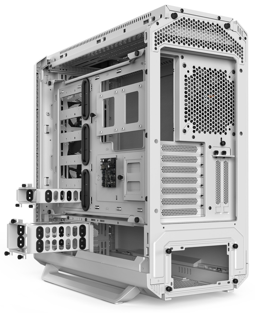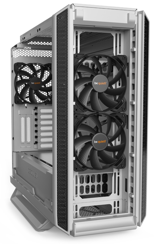 Kvalitní počítačová skříň formátu Middle Tower, která perfektně kombinuje vysoký stupeň modularity s absolutní tichostí. Vybavena je třemi prakticky neslyšitelnými ventilátory, které je možné díky regulátoru přepínat mezi režimy ticha nebo výkonu. Potěší také možnost rozšíření o dalších pět ventilátorů. Na horní straně se nachází dva USB 3.0 porty, jeden USB 2.0 port, sluchátkový výstup a vstup pro mikrofon. Podporuje montáž základních desek E-ATX, ATX, M-ATX a MINI-ITX. Pro disky pak slouží tři 3,5" pozice nebo až sedm 2,5" pozic. Důmyslné řešení umožňuje pohodlné umístění až 420 mm dlouhého výměníku vodního chlazení na přední straně. Skříň je dodávána bez zdroje.