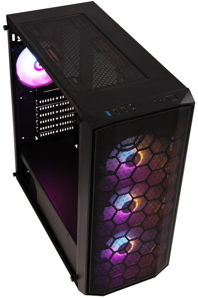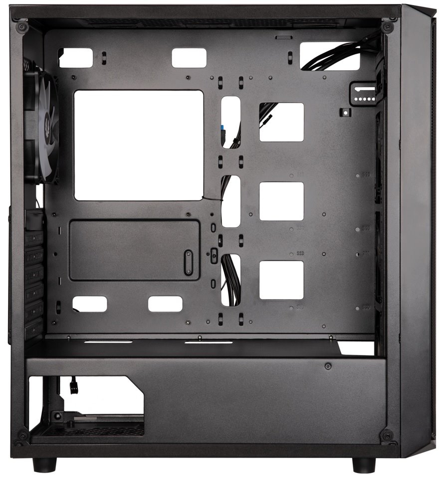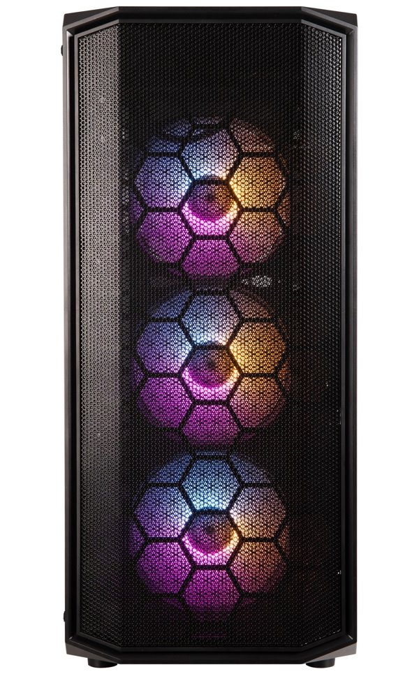 Kvalitní počítačová skříň formátu Middle Tower nabízí dvě 2,5" a dvě kombinované 2,5"/3,5" pozice pro SSD a pevné disky. Skříň je vybavena průhlednou bočnicí a poloprůhledným čelem s perforací pro optimální proudění vzduchu. Předinstalovány jsou čtyři 120mm ventilátory s ARGB podsvícením. Na horním panelu se nachází dva porty USB 3.0, jeden port USB 2.0, sluchátkový výstup a audio vstup pro mikrofon. Ve skříni je dostatek prostoru pro chladič CPU do výšky až 163 mm a grafickou kartu o délce až 380 mm. Důmyslné řešení umožňuje pohodlné umístění až 360 mm dlouhého výměníku vodního chlazení na přední straně. Potěší také přítomnost prachových filtrů. Skříň je dodávána bez zdroje.