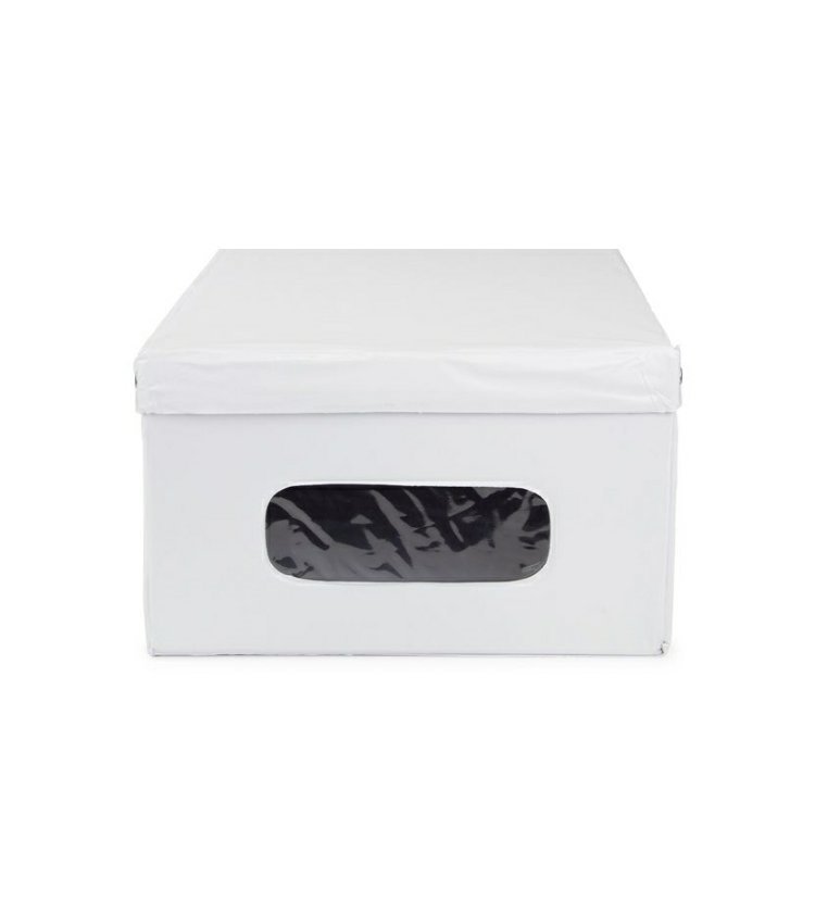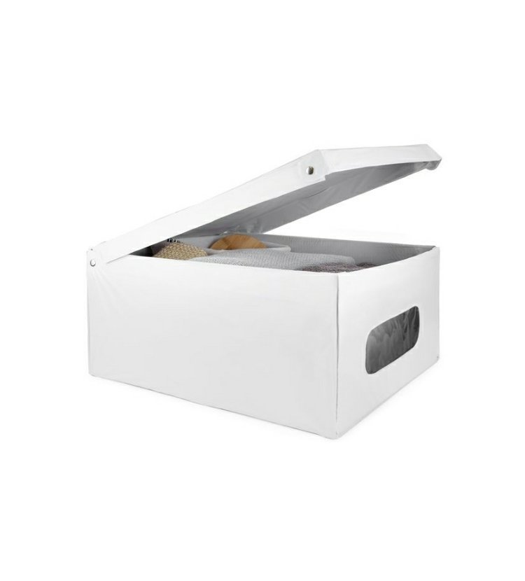 Úložné boxy a krabice Compactor Smart jsou stylové a zároveň praktické. Krabice je dost velká, abyste do ní uložili např. několik svetrů nebo sezónních doplňků, jako jsou čepice a šály. Můžete ji však používat na skladování téměř čehokoliv od kosmetiky po nejrůznější toaletní potřeby. Bílá barva se snadno sladí s každým interiérem a přední průhledné okénko vám pomůže rychle zjistit, co se v krabici ukrývá. Odolnost krabice zajistí použitý materiál – zesílená lepenka potažená PVC.
