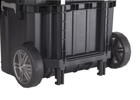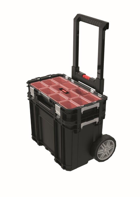 Kovové odolné západky zajistí pevné uzavření boxu. Jeho obsah se vám tedy nevysype a zůstane v bezpečí. Teleskopické madlo a gumová kolečka vám navíc zjednoduší jeho přenášení a manipulaci.