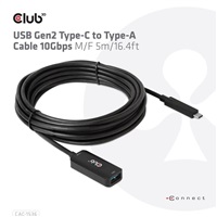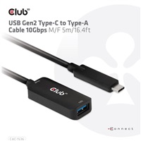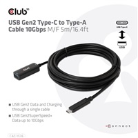 The Club 3D CAC-1536 USB Gen2 Type-C to Type-A Cable 10Gbps M/F 5m/16.4ft cable connects your Notebook, Tablet or Phone with USB Type-C output to your favorite existing Peripherals, Accessories and Chargers featuring the common USB Type-A plug. It enables Data and Power over a single cable and both ways. This cable supports USB 3.2 Gen 2. SuperSpeed+ data up to 10Gbps and up to 900mA output for Downstream charging or powering your USB Type-A enabled Notebook, Tablet or Smartphone.