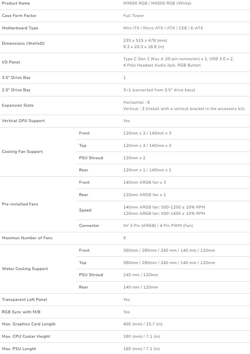 The MX600 RGB supports dual top and front 360mm water cooling