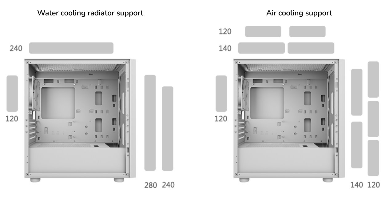 - Supports choice of 280mm (max) water cooling or 160mm (max) air