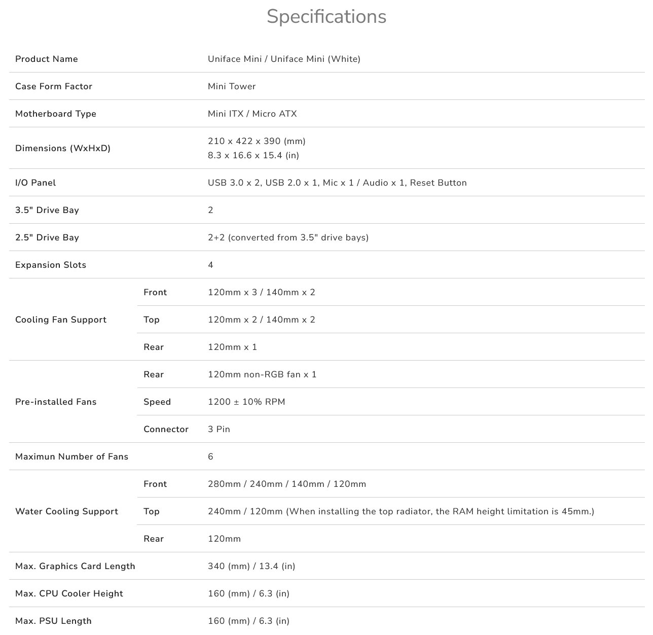 The Uniface Mini is a compact mini tower that packs an array of features into its diminutive size. The perforated front panel inherited from its bigger sibling – the Uniface RGB – provides superior ventilation and retains COUGAR’s distinctive visual identity, while a tempered glass left panel showcases your build. With a deceptively compact layout that allows you to install up to 6 fans, supporting GPUs of up to 340mm and a choice between a 280mm (maximum) water cooler radiator or a 160mm (maximum) air cooler, the Uniface Mini is proof that great things come in small packages.