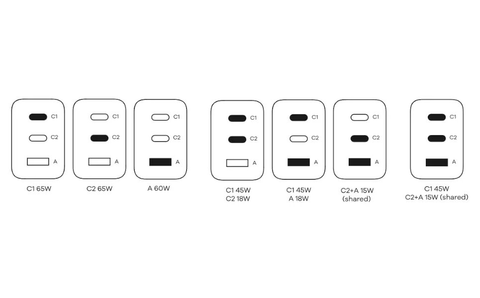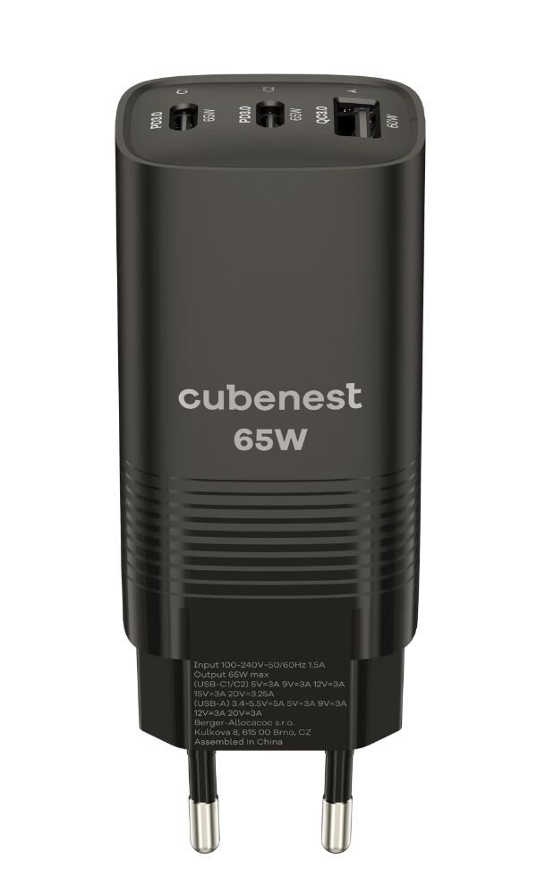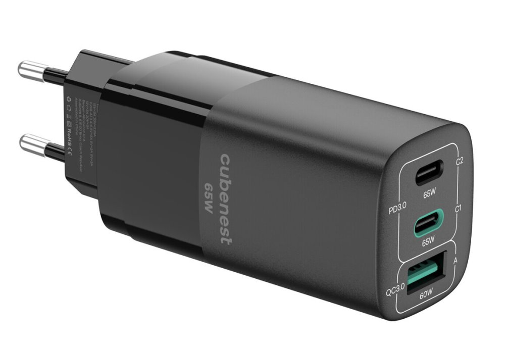 Kompaktní napájecí adaptér s výkonem až 65 W disponuje dvěma USB-C porty a jedním portem USB. Díky tomu umožňuje nabíjení až tří zařízení současně. Kromě tradičního nabíjecího formátu Power Delivery 3.0 disponuje také novým Power Delivery PPS, který je výrazně šetrnější k baterii a tím prodlouží její životnost. Použitá GaN technologie snižuje tvorbu tepla, čímž zvyšuje účinnost nabíječky při zachování kompaktních rozměrů. Samozřejmostí je tepelná, přepěťová, proudová a zkratová ochrana.