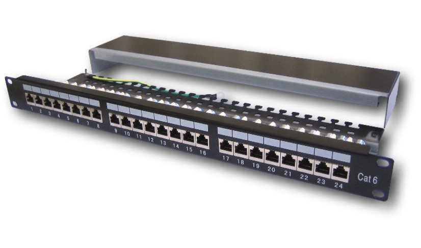 19" STP Patch panel DATACOM 24 port CAT.6 - 19" Stíněný patch panel určený pro montáž do 19" datových rozvaděčů. - 3 x 8 pozic zářezového pole LSA (krone) - 24 stíněných RJ45 portů - hloubka 11 cm - výška 1U - CAT.6 - horní zářez - barva černá