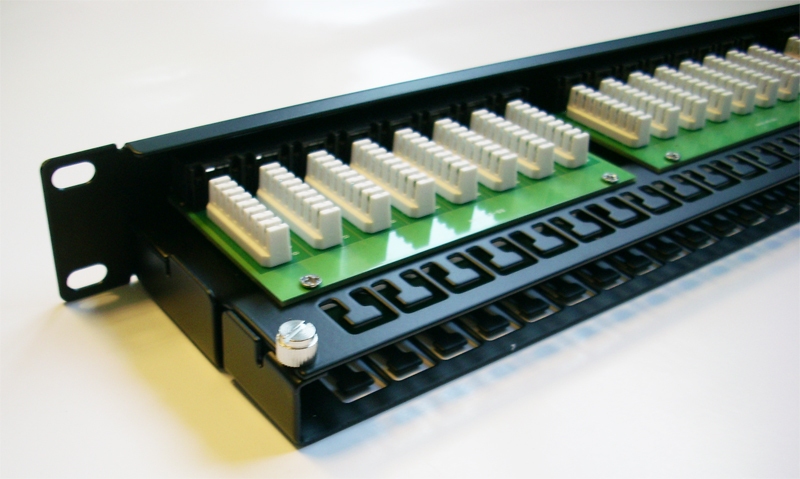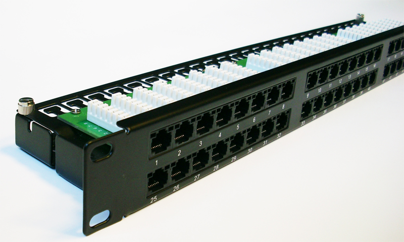 19" UTP Patch panel DATACOM 48 port- 19" Patch panel určený pro montáž do 19" datových rozvaděčů- 6 x 8 pozic zářezového pole LSA krone- výška 1U- cat. 5e- horní zářez- včetně vyvazovacího panelu- barva černá