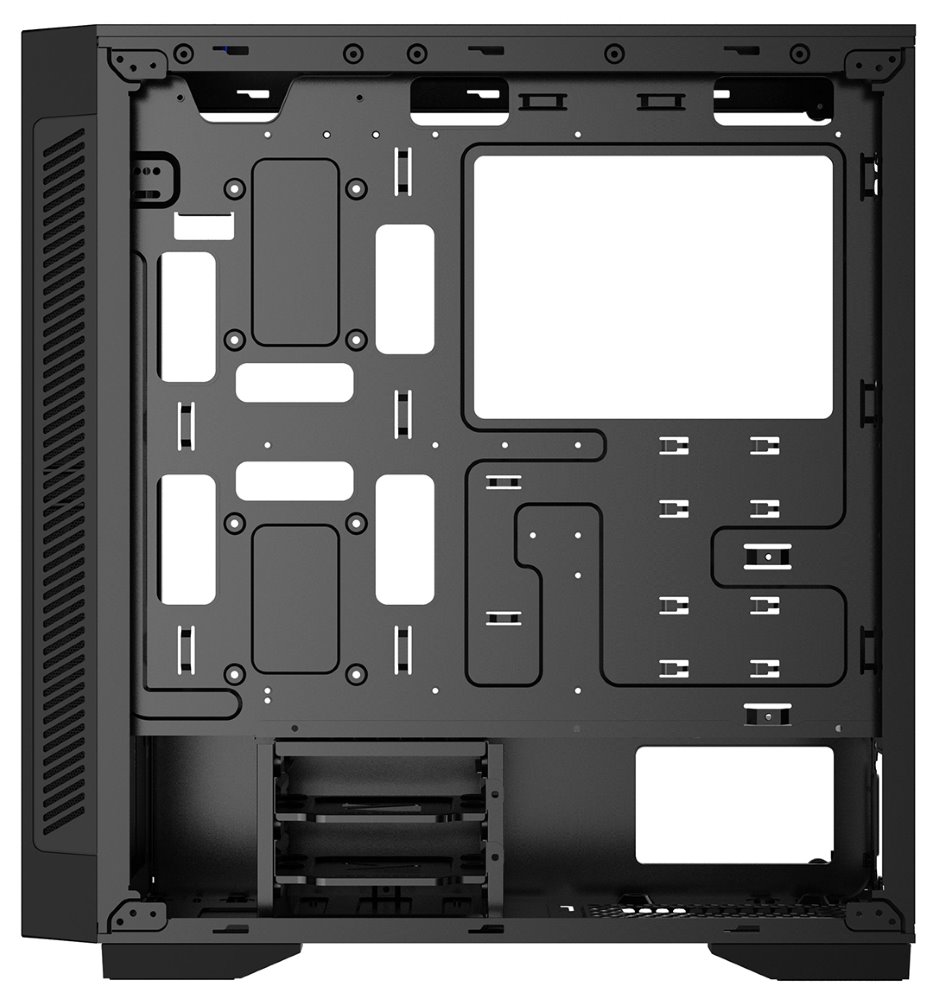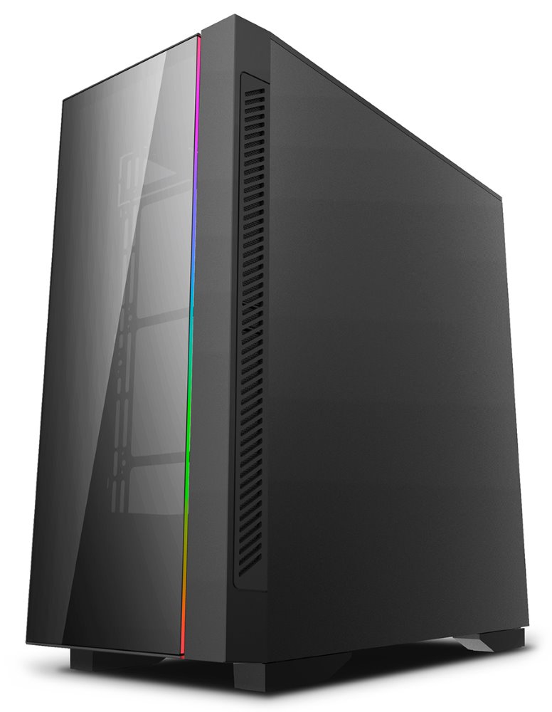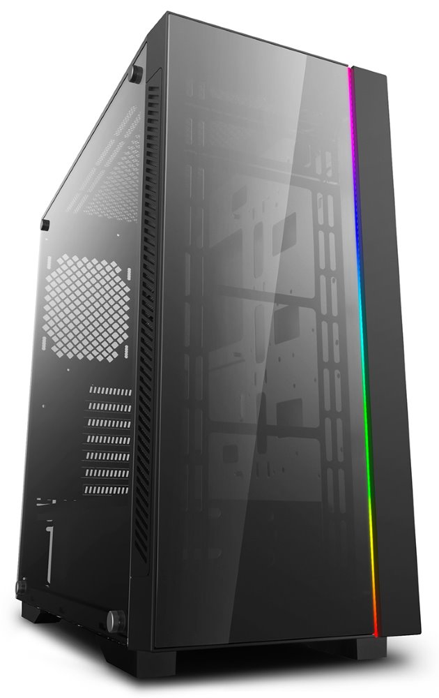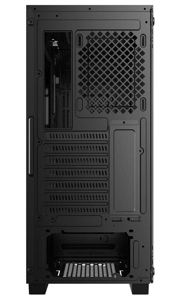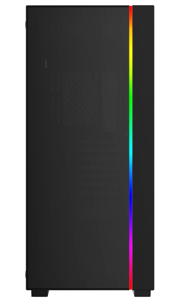 Skříň formátu Middle Tower nabízí dvě 2,5" pozice pro SSD disky a dvě 3,5" pozice pro pevné disky. Na horním panelu se nachází dva USB 2.0 porty, jeden USB 3.0 port, sluchátkový výstup, audio vstup pro mikrofon a ovladač podsvícení. Skříň je vybavena ARGB LED páskem, který spolu s průhlednou bočnicí a předním panelem zajišťuje vytříbený design. Důmyslné řešení umožňuje pohodlné umístění až 360 mm dlouhého výměníku vodního chlazení na přední straně. Ve skříni je dostatek prostoru pro chladič CPU do výšky až 160 mm a grafickou kartu o délce 370 mm. Skříň je dodávána bez zdroje. Součástí je také sada prachových filtrů.