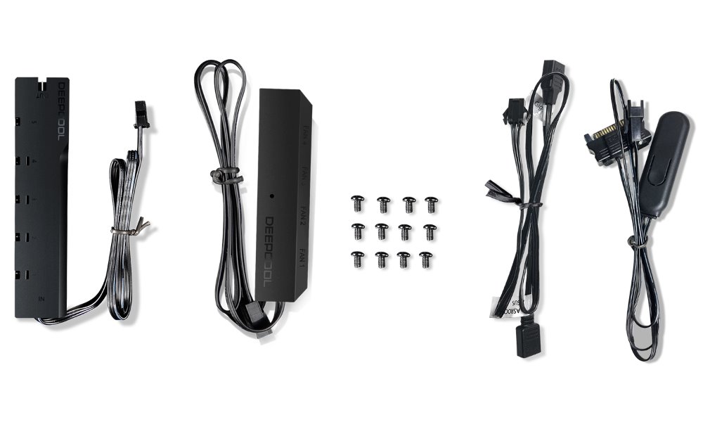 Součástí balení jsou tři ventilátory, PWM a ARGB hub, synchronizační kabel a ARGB ovladač pro rychlé manuální nastavení režimu, rychlosti a barvy osvětlení.