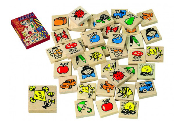 Pexeso z dřevěných kamenů o rozměrech 40x40x10 mm s potiskem obrázků. Výrobek splňuje požadavkyEU na bezpečnost hraček a je vhodný pro děti od 3 let.