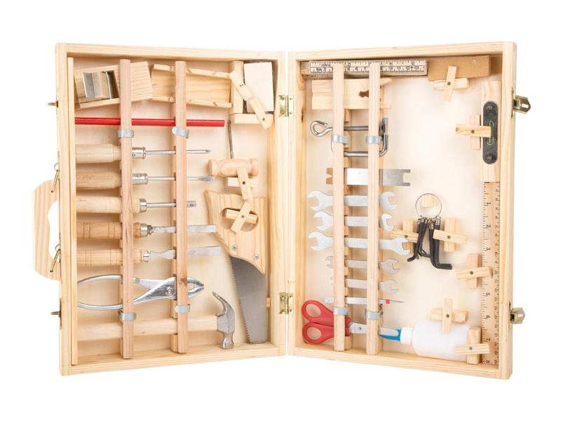 Kufřík Deluxe je vrcholem všech dřevěných kufříků s nářadím: Závěsná dřevěná krabice s 48 díly pro malé domácí kutily! V kufříku Deluxe najdete všechno potřebné dřevěné i kovové nářadí potřebné pro všechny druhy prací a oprav. Najdete v něm klíče, šroubováky, pilu, nůžky, dláto, tesařskou tužku, šestihranný klíč, kladivo a další! Každá položka má své místo v kufru, všechny díly jsou vybaveny pojistkami, které je na svém místě drží.