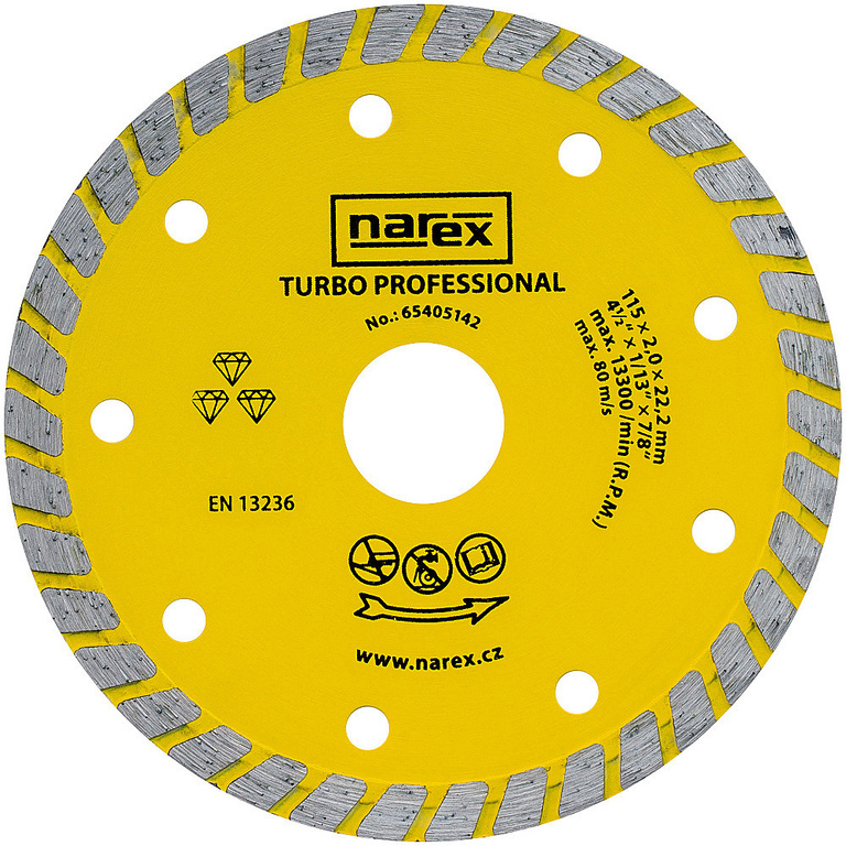 Diamantový kotouč Narex Turbo Professional pro použití s úhlovými bruskami. Hravě rozřízne veškerý stavební materiál, jako jsou cihly, dlaždice, beton nebo asfalt. Jedná se o celoobvodový kotouč se šikmým segmentem a tenkým ocelovým tělem pro řezání za sucha. Díky tomuto náčiní s kontinuálním pásem segmentu docílíte rychlých a čistých řezů bez otřepů nebo zabarvení. Kotouč o průměru 115 mm má řezací plochu o síle 2 mm, takže zastane mnoho práce. Rozměr otvoru pro upevnění k nástroji činí 22,23 mm.