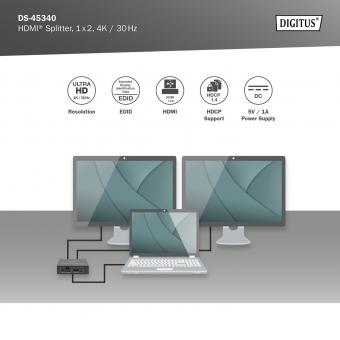 Rozdělí vstupní signál HDMI na dva výstupní displeje. Podporuje