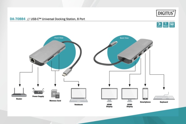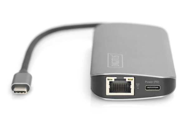 Digitus 8portová dokovací stanice USB-C, 2xUSB3.0, 1xRJ45, 2xHDMI, 1xPD, 1xMicro SD, 1xSD, šedá