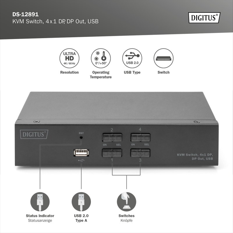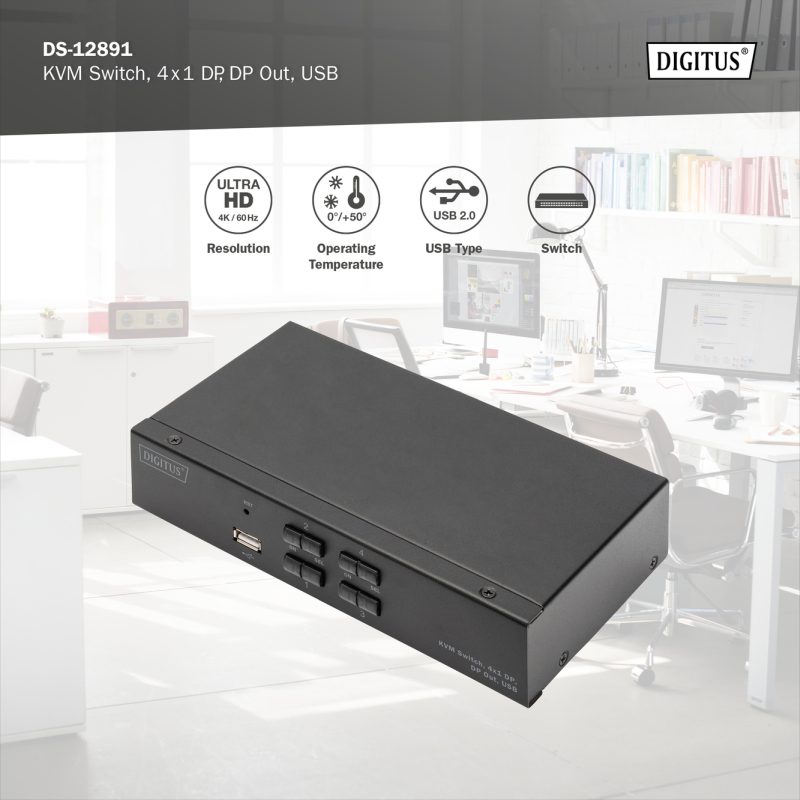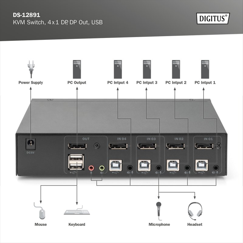 Vstupy: 4 x Displayport vstupy (4x1), 4 x USB B, 2 x audio combo