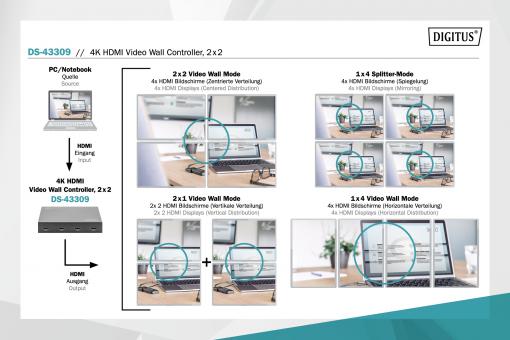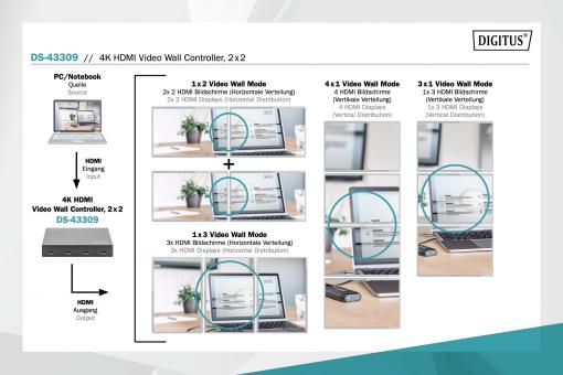 S řadičem videostěny DIGITUS® 2x2 můžete transformovat celkem 4