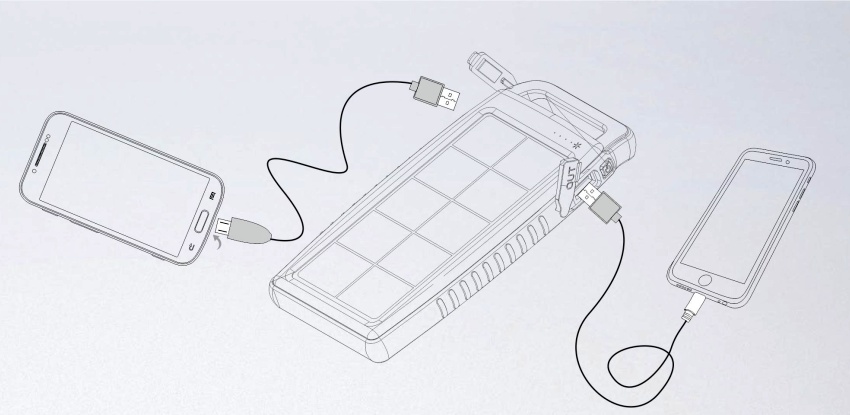 (5V/2A) pro nabíjení, 2x USB výstup (5V/2,1A) - i současně, 1W LED