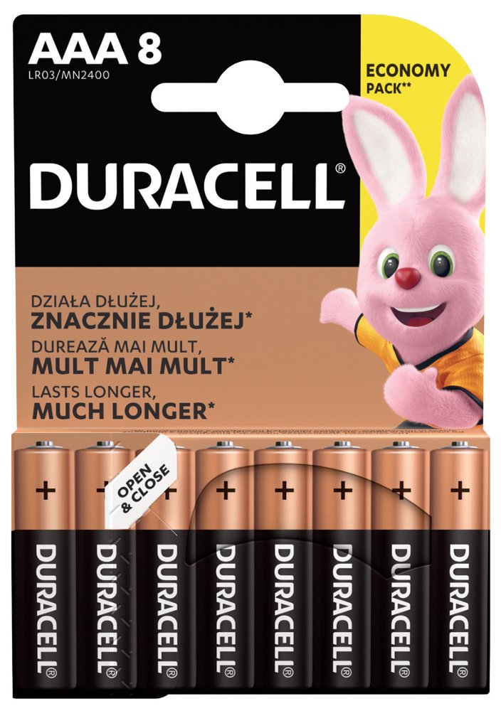 Baterie Duracell Basic jsou víceúčelové alkalické baterie vhodné pro běžné přístroje. Dokonalé uzavření horní části nylonem pomáhá předcházet vytečení baterií. Technologie Duralock udržuje nepoužívané baterie Duracell při běžném skladování jako nové a nabité po dobu až 10 let. Balení obsahuje 8 kusů baterií.