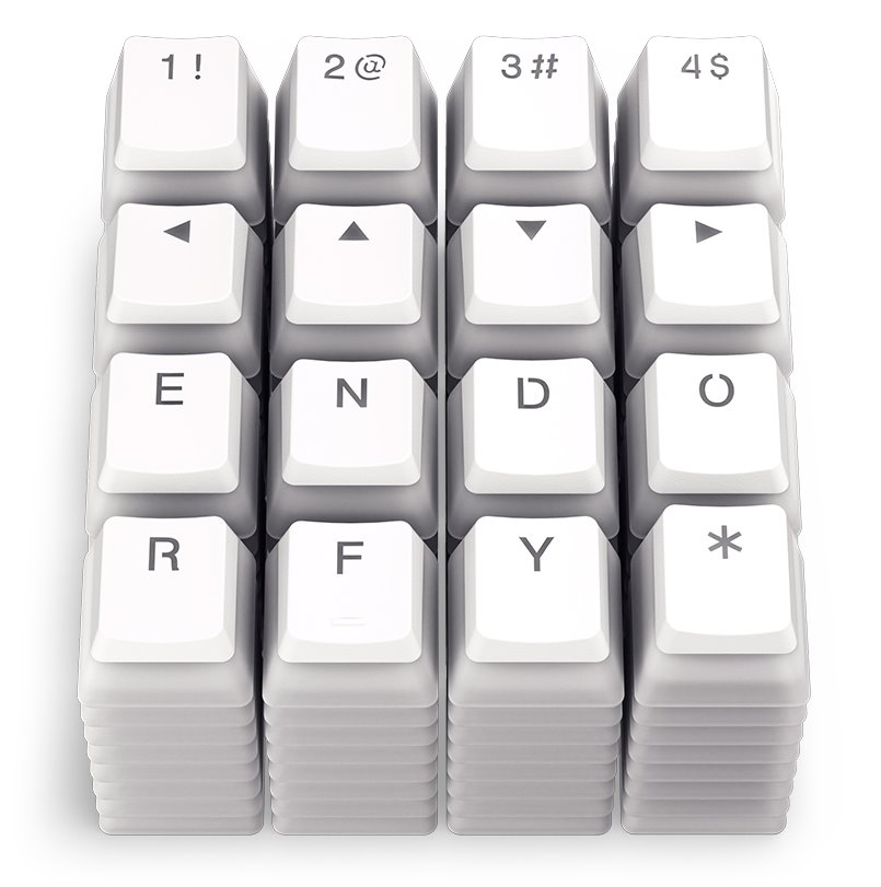 Set skládající se ze 104 kláves v průhledném dvouvrstvém stylu. PBT materiál zajistí komfort při každodenním používání i dlouhodobou odolnost proti opotřebení. Součástí je i sada tlumících gumových kroužků nainstalovaných přímo na klávesách a plastová pinzeta pro vyjmutí kláves.