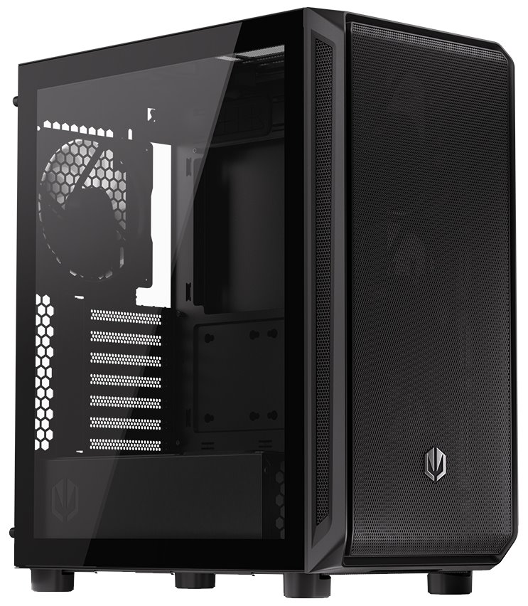 Skříň formátu Middle Tower s průhlednou bočnicí nabízí šest 2,5" pozic pro SSD disky a jednu 3,5" pozici pro pevný disk. Na horním panelu naleznete dva porty USB 3.0, jeden port USB-C a dále také konektor pro sluchátka a konektor pro mikrofon. Skříň je osazena pěti ventilátory o velikosti 140 mm. Důmyslné řešení umožňuje pohodlné umístění až 360 mm dlouhého výměníku vodního chlazení na přední straně. Ve skříni je dostatek prostoru pro chladič CPU do výšky až 179 mm a grafickou kartu o délce 350 mm. Skříň je dodávána bez zdroje. Součástí je také sada prachových filtrů.