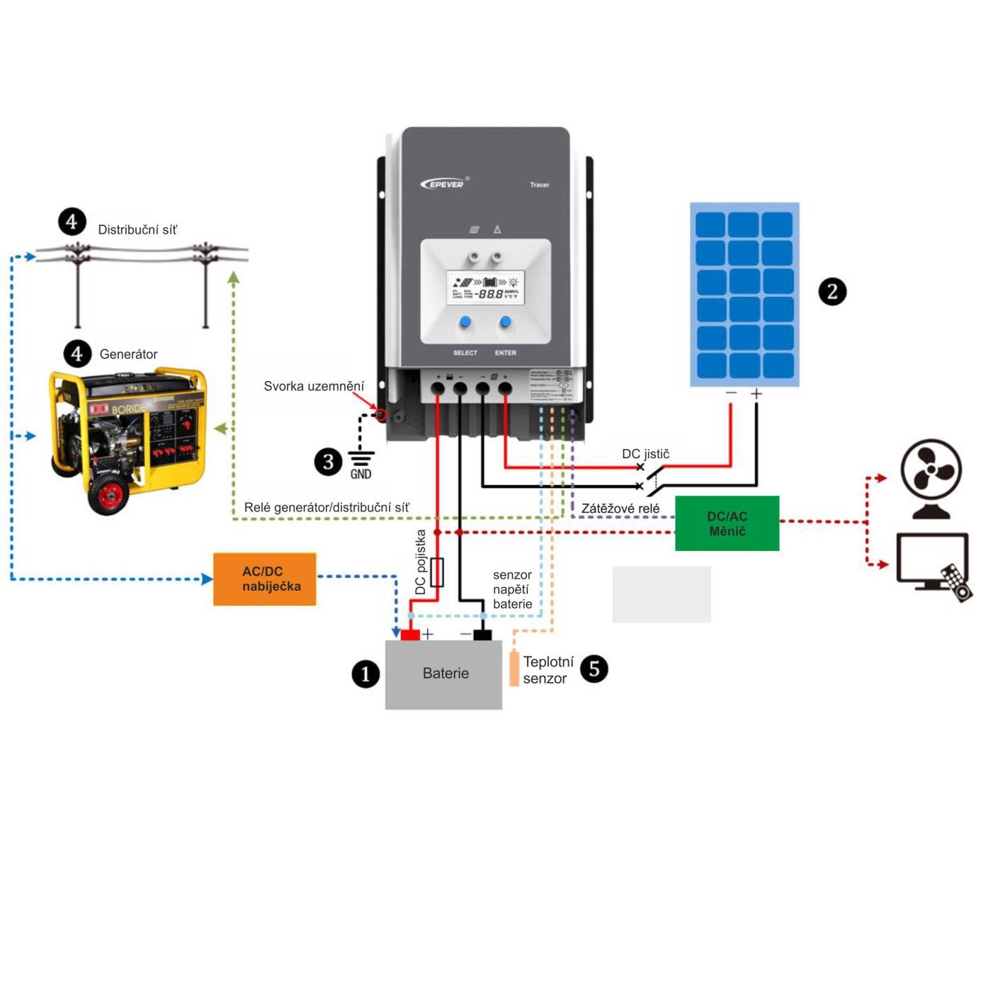 Relé zátěže nebo automatického řízení generátoru usnadňují vytvoření hybridního systému napájení. Komplexní elektronické ochrany, včetně ochrany proti přebíjení, nadměrnému vybíjení a ochrany proti obrácení polarity FV účinně zajišťují bezpečnější a spolehlivější provoz solárního systému po delší dobu. Izolované rozhraní RS485 se standardním komunikačním protokolem MODBUS a 5 V napájením usnadňuje spotřebiteli zařízení rozšířit, podporuje provoz až 8 regulátorů v řadě pro rozšíření systému a splňuje různé monitorovací požadavky, takže jej lze použít v různých zařízeních, jako např. solární RV, domácí systémy, terénní monitorování atd.